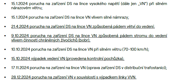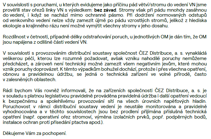 ČEZ v ní rekapituluje výpadky v roce 2024, omlouvá se za výpadky, deklaruje prvořadý zájem na zajištění spolehlivých dodávek elektřiny zákazníkům a uvádí, že všechny události jsou způsobeny poruchami na vysokém napětí a nemají tedy souvislost s okolností, zda je vedení v obci "vzdušné", nebo "zemní".